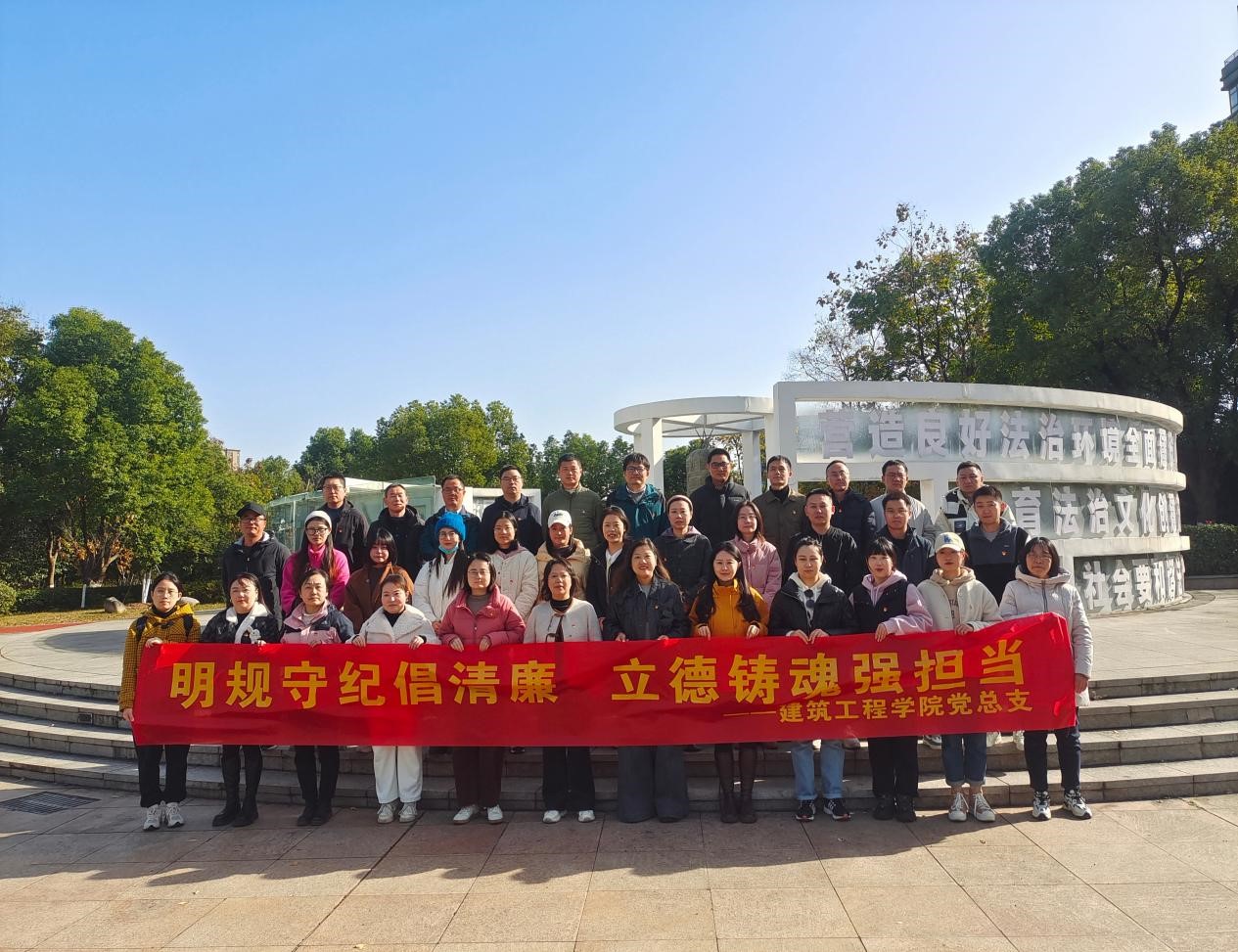 伴着冬日的暖阳,同志们驱车来到巢湖市法纪文化公园,依次参观了法治宣传步道、法家思想文化景墙、包拯主题雕塑、家风家训石墙等景点。“法”的起源、传承和发展,优秀人物的家风家训,不同时期的廉洁故事和人物故事,启迪着现场的每位教职工缅怀先贤,学有榜样,历览众腐,警钟长鸣。