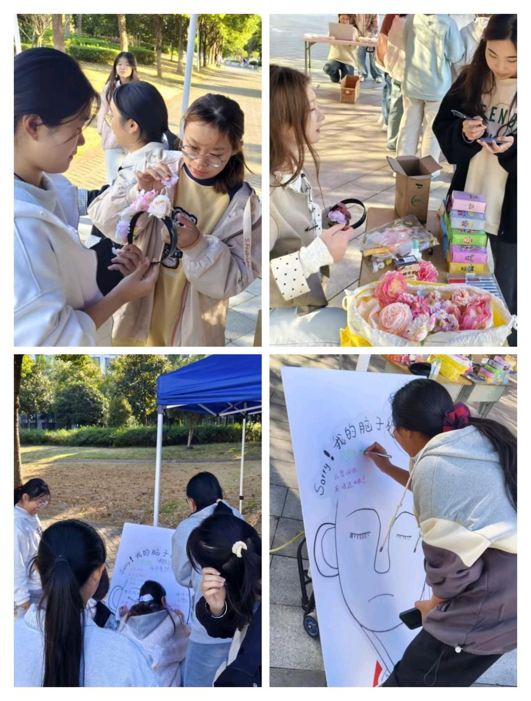 簪花体验区,文艺团提前准备了茉莉、月季、雏菊等十余种仿真花朵,以及发簪、丝带、胶水等工具,参与者可根据喜好挑选花朵,从花瓣修剪、层次搭配到固定造型,一步步将零散的花材打造成精致的头饰。“第一次亲手做簪花,才发现传统头饰里藏着这么多讲究。”24建工3班的张兴如同学手持自己制作的簪花发箍,兴奋地展示成果,现场不少同学拍照记录自己的簪花作品,分享至社交平台。