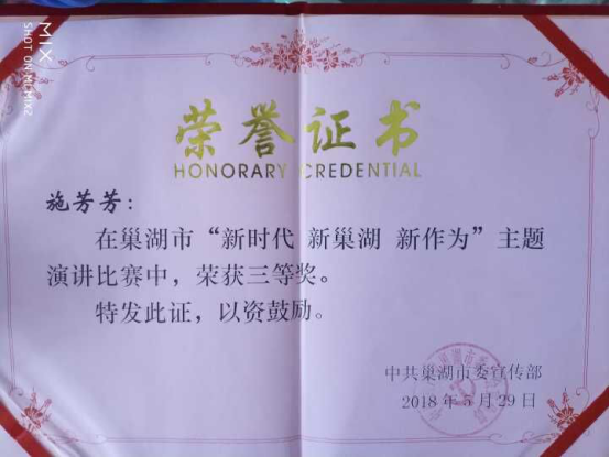 我院施芳芳老师在巢湖市“新时代 新巢湖 新作为”主题演讲比赛中荣获三等奖