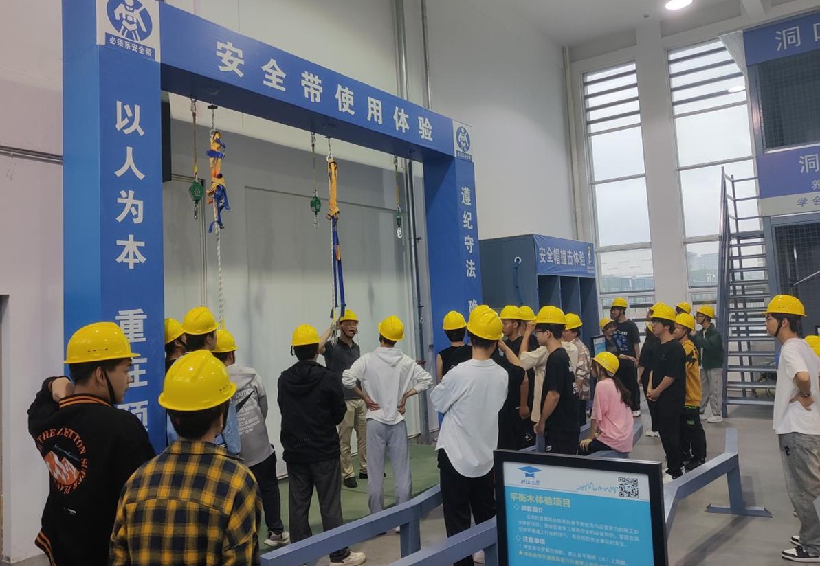 为加强2024届顶岗实习学生的安全意识,世界杯体育官方网站在科技活动周期间还组织开展了施工现场安全科普活动。建筑实训工厂作为合肥市科普教育基地创建单位,内部设有完整的施工现场安全体验设备、设施。在现场科普老师的带领下,学生进行了综合用电演示体验、安全帽撞击体验、安全带使用体验、洞口坠落体验、护栏推到体验等。同学们在体验中真切感受到施工现场安全容不得半点马虎,必须要严格按照施工标准、规范要求操作。