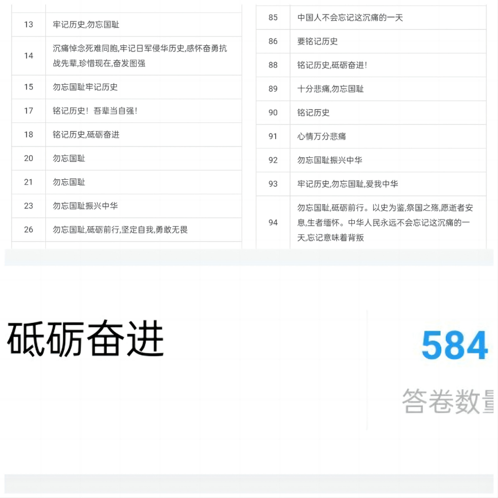 通过合职建工志公众号发布知识竞答,号召同学们积极参加答题自测,加强对国家公祭日和中国抗日战争历史知识的学习。本次知识答题参与人数为584人,及格率为100%,优秀率为98.1%,同学们还纷纷留言,表达了吾辈当砥砺奋进、振兴中华的志愿。