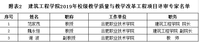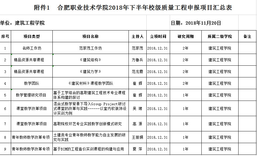 根据《关于开展2018年下半年校级教学质量与教学改革工程申报工作的通知》(合职院教[2018]48号)通知要求,我院积极组织各教研室申报质量工程,截至目前共收到9项(见附件1),将于2018年11月19日14:00—16:00在世界杯体育官方网站会议室208,拟组织专家(见附表2)对我院申报2018年度下半年校级教学质量与教学改革工程项目共9项进行评审。