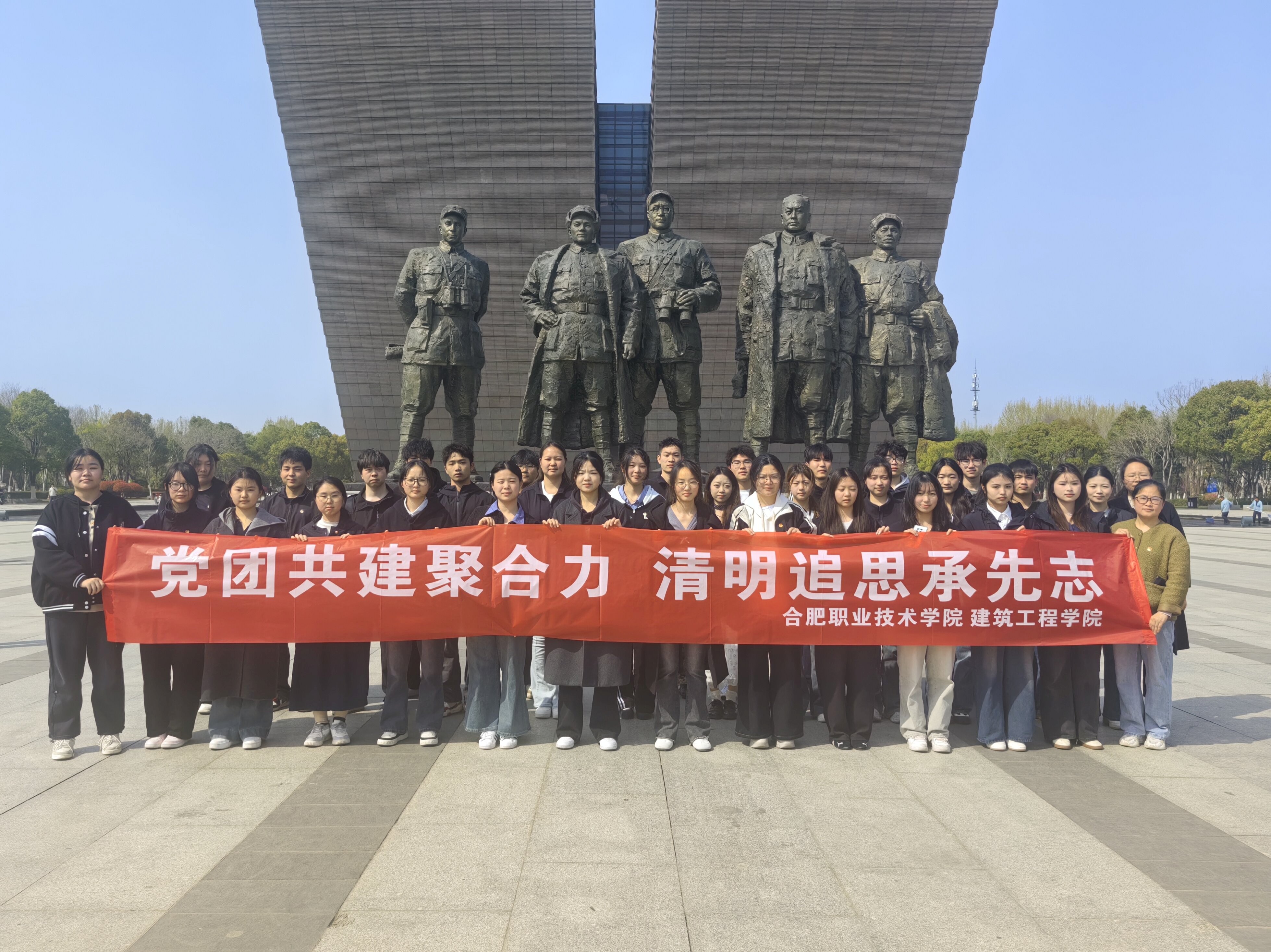 活动伊始,30余名党团员肃立于纪念馆南门的五位渡江战役将领的雕像前。全体师生垂首默哀,致敬追思革命先烈。