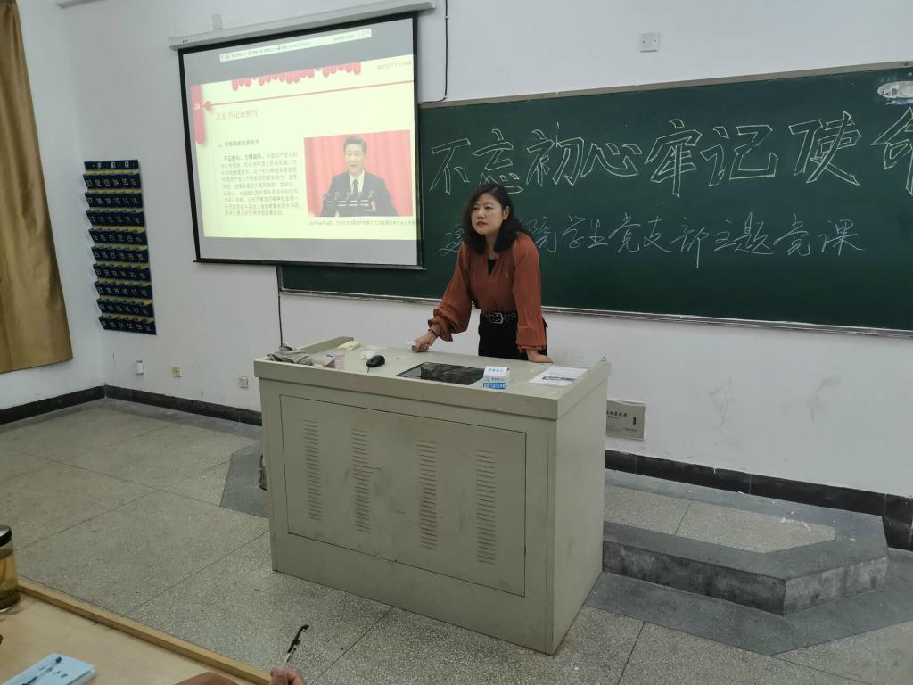 根据学校“不忘初心、牢记使命”主题教育工作部署和世界杯体育官方网站党总支工作安排,10月23日下午两点三十分世界杯体育官方网站学生党支部在教学楼B201教室开展主题党课活动。学生党支部书记施芳芳以“守初心、担使命”为主题为支部全体党员和入党积极分子讲授了一堂形象生动、令人印象深刻的党课。院党总支书记宁业群以普通党员身份参加了支部的学习活动。