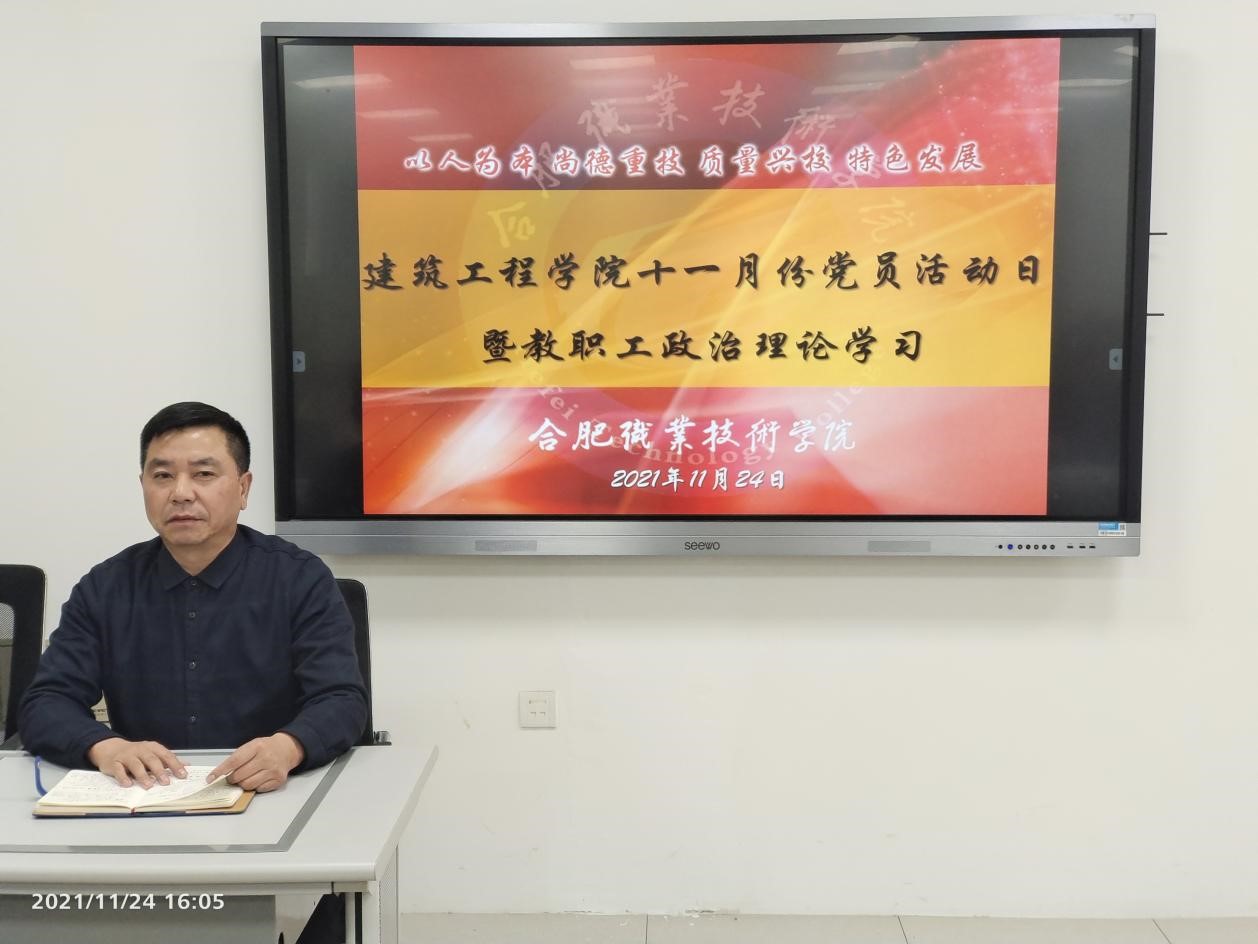 随后,在集体观看《党的十九届六中全会<公报>解读》视频后,院长范家茂分享学习十九届六中全会精神心得并就近期工作了部署。他强调了专业社团工作、教师课堂把控能力和实践能力的重要性,号召全体教师立足本职,从党的百年奋斗重大成就和历史经验中汲取奋进力量,奋勇争先。