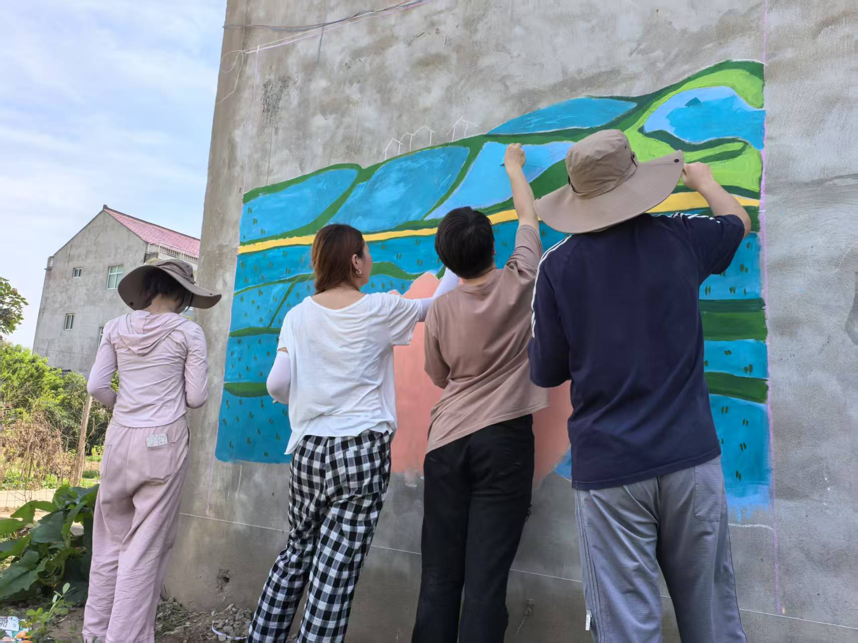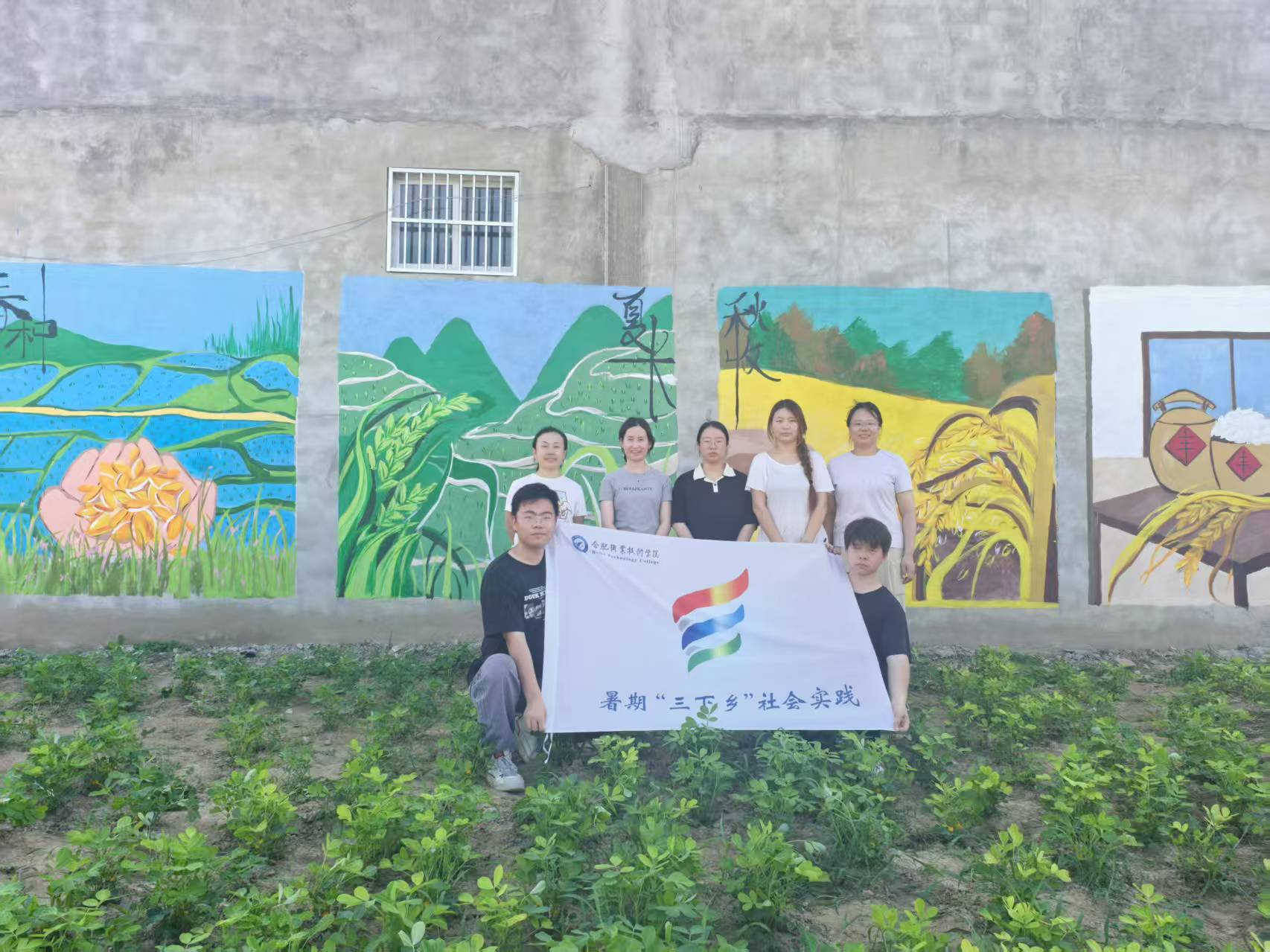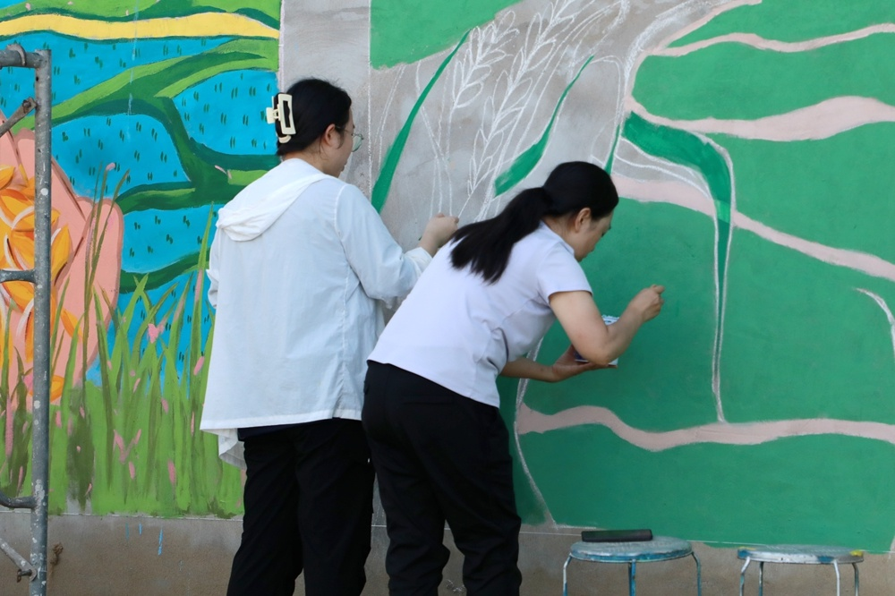 发挥艺术设计特长,美化村居环境、赋能文化振兴是本次实践的另一亮点。实践团精心策划,选定乐土镇陈营村村民文化广场作为创作基地。紧扣“中国传统农耕文化”主题,团队成员们顶着烈日,挥洒汗水,一笔一画精心绘制了“春种”“夏长”“秋收”“冬藏”为主题的四季万物生长系列墙绘作品。原本单调的墙面华丽变身,成为传递展示乡土魅力、提升乡村颜值的亮丽文化景观,赢得了当地干部群众的交口称赞。