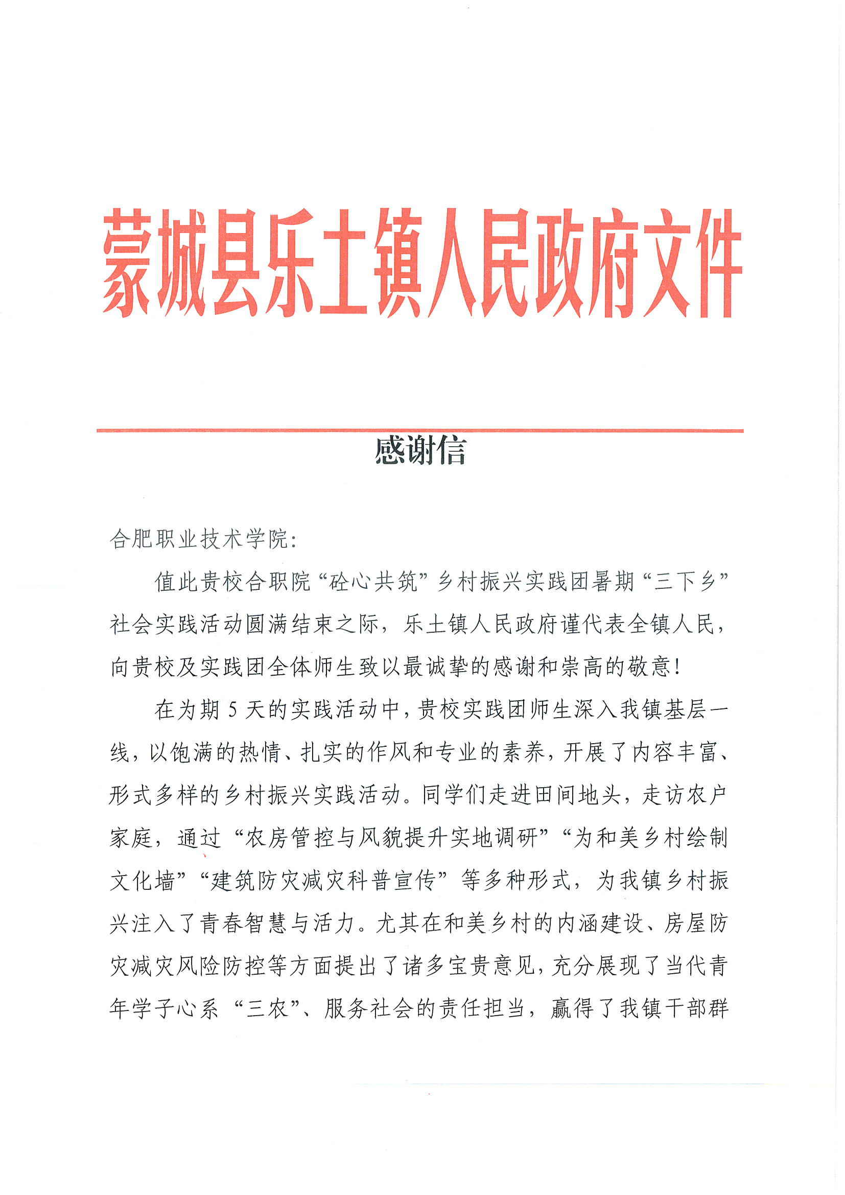 为深入贯彻国家乡村振兴战略,引导青年学子在实践中受教育、长才干、作贡献,6月30日至7月4日,合职院“砼心共筑”乡村振兴实践团一行7名师生,赴亳州市蒙城县乐土镇开展了为期5天的暑期“三下乡”社会实践活动。实践活动聚焦乡村建设,围绕“农房管控与风貌提升调研”“绘制文化墙为和美乡村添彩”“建筑防灾减灾科普宣传”三方面实践内容,取得了丰富成果,获得了当地政府和村民的一致好评。
