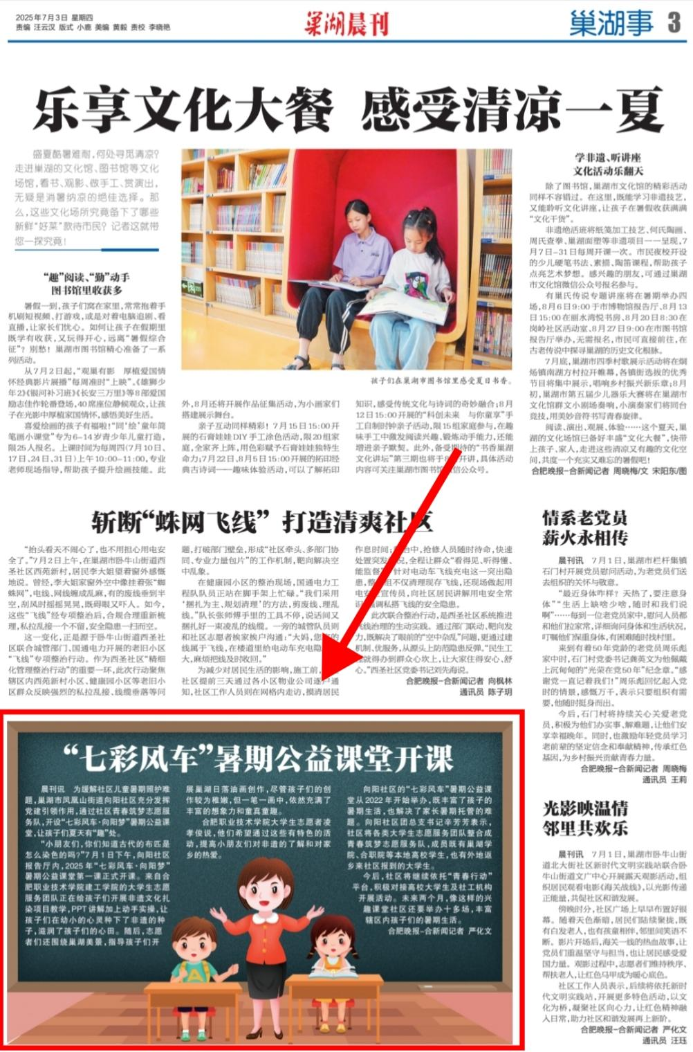 6月30日至7月6日,世界杯体育官方网站世界杯体育官方网站“微光成炬 一路向阳”实践团走进巢湖市凤凰山街道向阳社区,开展为期一周的“七彩风车・向阳梦”暑期公益课堂活动。7名实践团成员带着精心设计的课程方案,为社区儿童带来了一段充实而有趣的学习时光。