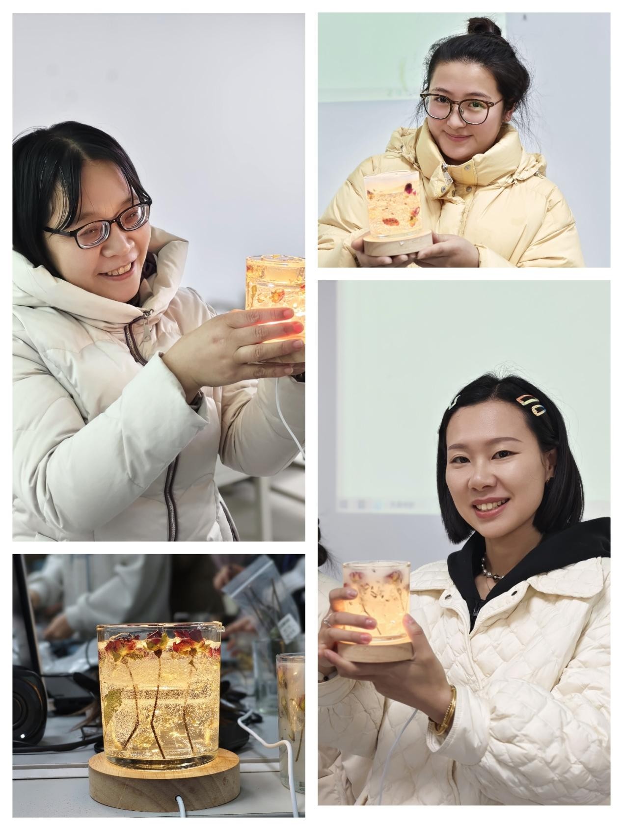 经过一个多小时的努力,一个个精美的水晶香薰蜡烛呈现在大家眼前。它们或流光溢彩,或清新夺目,每一盏都凝聚着老师们的心血与创意,每一盏都散发着独特的光芒与芬芳。活动最后,大家手持自己的作品合影留念,记录下这美好的瞬间。