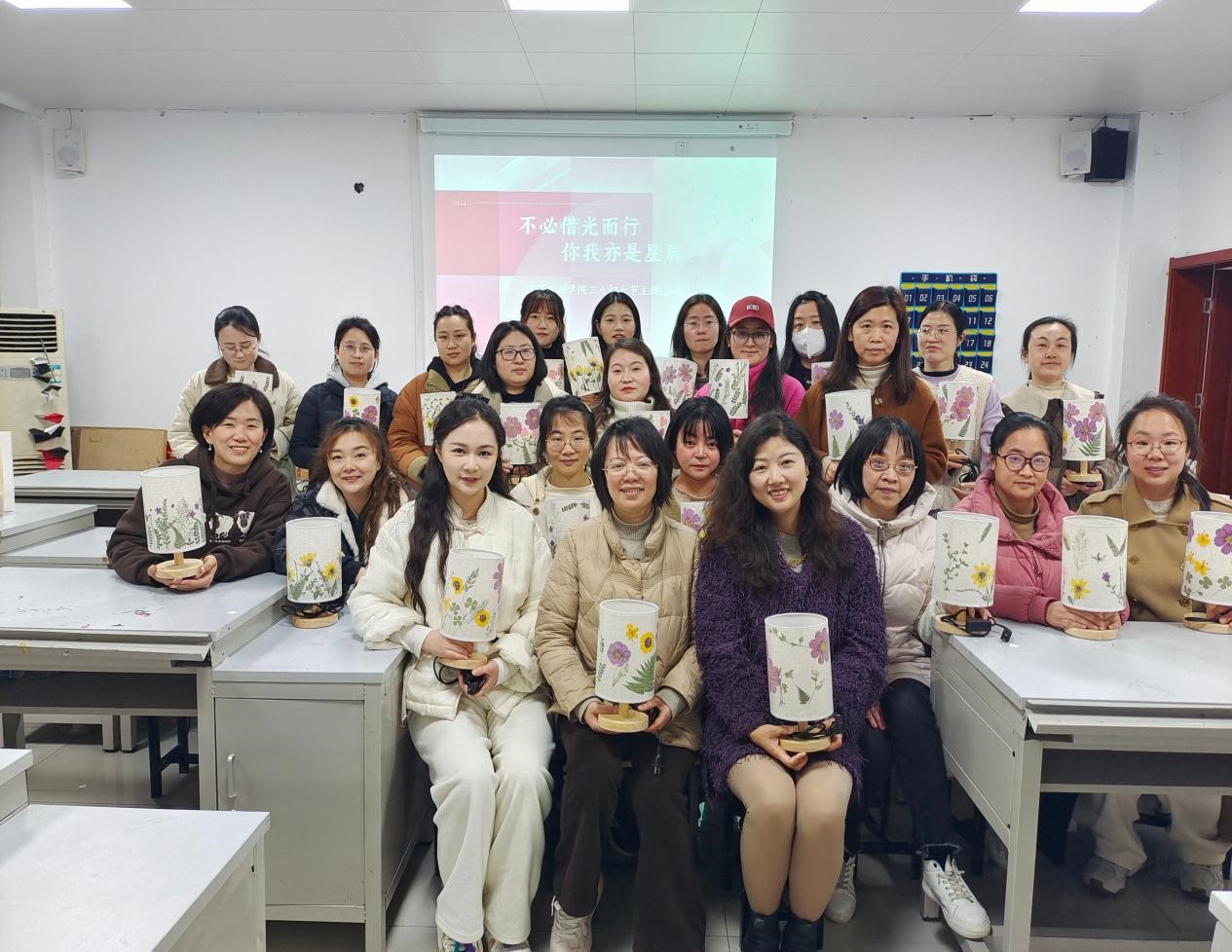为纪念第114个“三八”国际妇女节,展现女教师风采,丰富女教师文化生活, 3月13日下午,世界杯体育官方网站全体女教师开展“不必借光而行 你我亦是星辰”三八妇女节主题活动——干花台灯DIY制作。