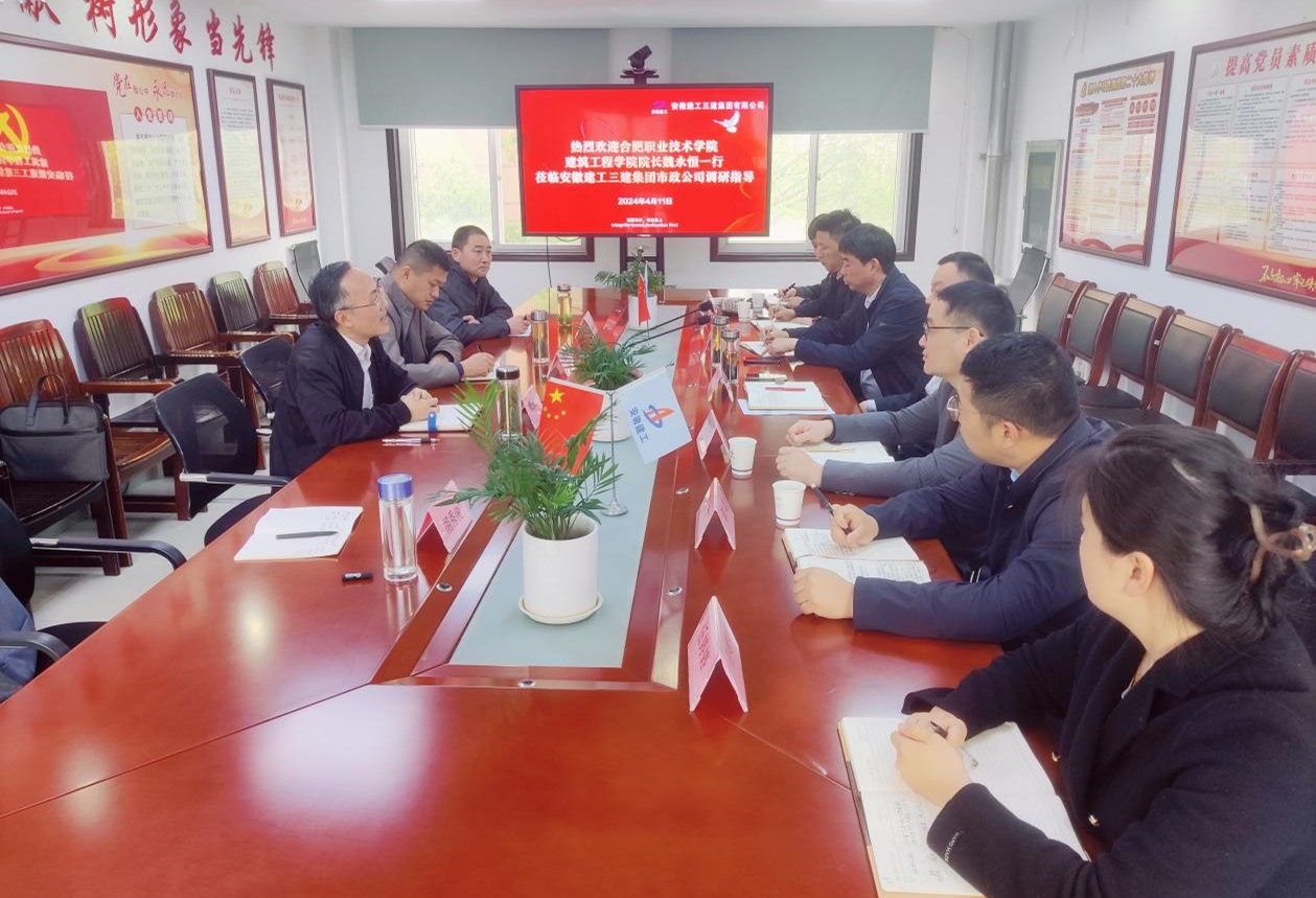 为全面了解企业用人需求,开拓更多就业岗位,助力学生高质量就业,4月11日,世界杯体育官方网站副院长(主持工作)魏永恒、副院长邓勋、教学办主任胡秀俊、工程造价教研室主任黄军福一行四人前往安徽建工三建集团市政公司开展访企拓岗活动。安徽建工三建集团市政公司经理王寅生、书记刘德连、副经理姚平、副经理洪文及相关部门负责人参加交流研讨。