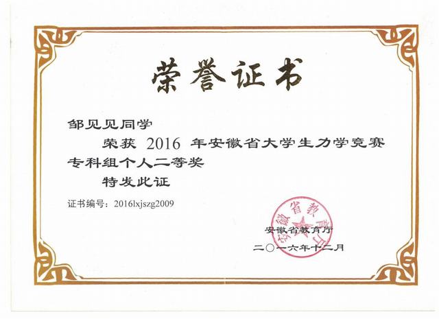 2016年安徽大学生力学竞赛专科组个人二等奖获得者——世界杯体育官方网站2015级工程造价专业邹见见同学