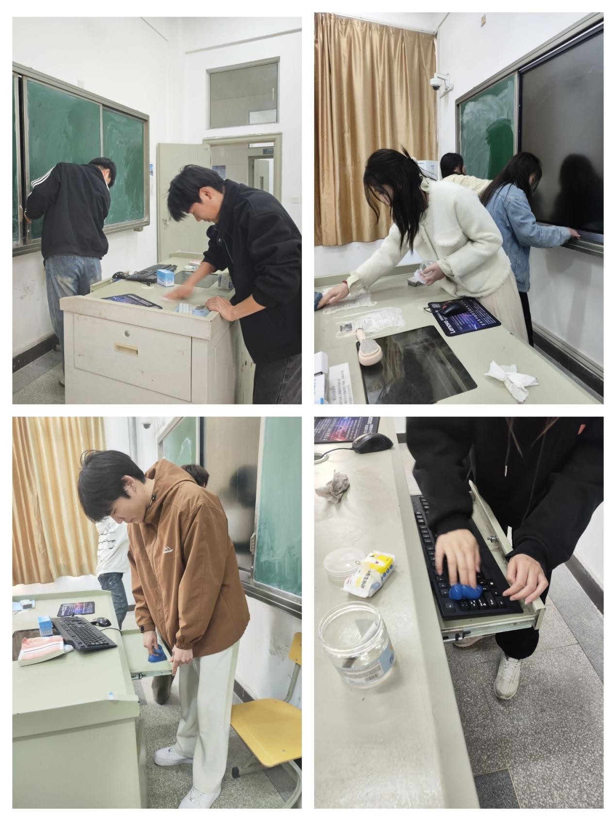 3月11日下午,同学们上完课后,早早地集结在鼓山校区C教学楼下。他们带着专业工具,如柔软的清洁布、专用清洁剂等,准备为教室里的多媒体设备来一场全方位、无死角的深度清洁。在班长简短的动员后,大家迅速分组进入各个教室,一场与灰尘 “作战” 的行动正式拉开帷幕。