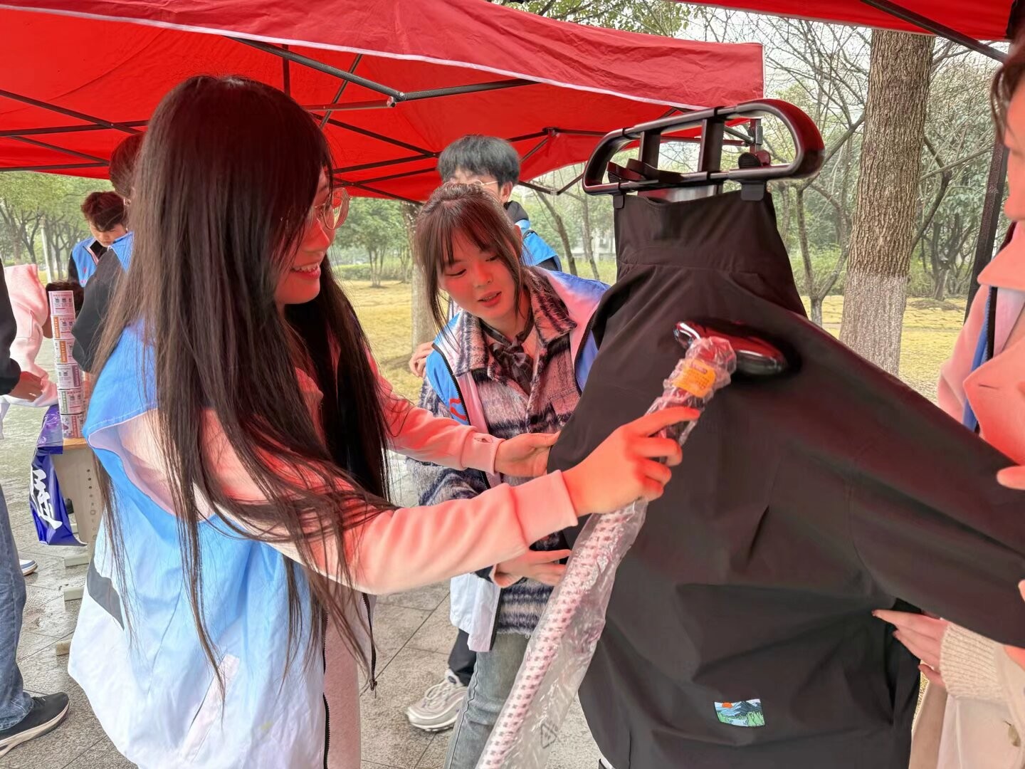 “抚平褶皱暖人心” 活动同样受到师生们的欢迎。志愿者们在活动区域设置了熨烫设备,耐心地为师生熨烫衣物。无论是因长时间存放而产生褶皱的衬衫,还是被压得皱巴巴的外套,经过志愿者们的巧手处理,都变得平整如新。大家有序排队,现场气氛融洽,志愿者们用实际行动传递着关怀与温暖。