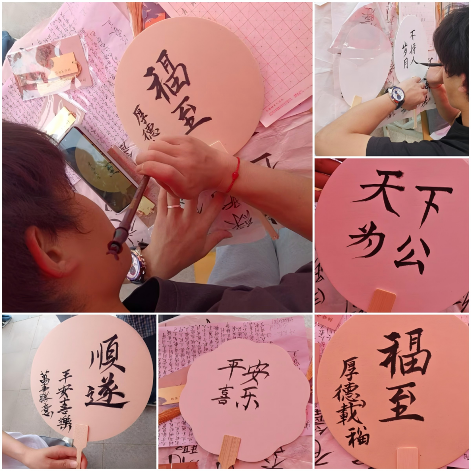 随后,书法协会的成员们大显身手。他们在广场的案台前铺开笔墨,根据同学们的要求,在素扇上挥毫泼墨,题下一句句寓意美好的诗词、名言。或苍劲有力、或飘逸灵动的字体,为空白的扇面赋予了独特的艺术魅力。