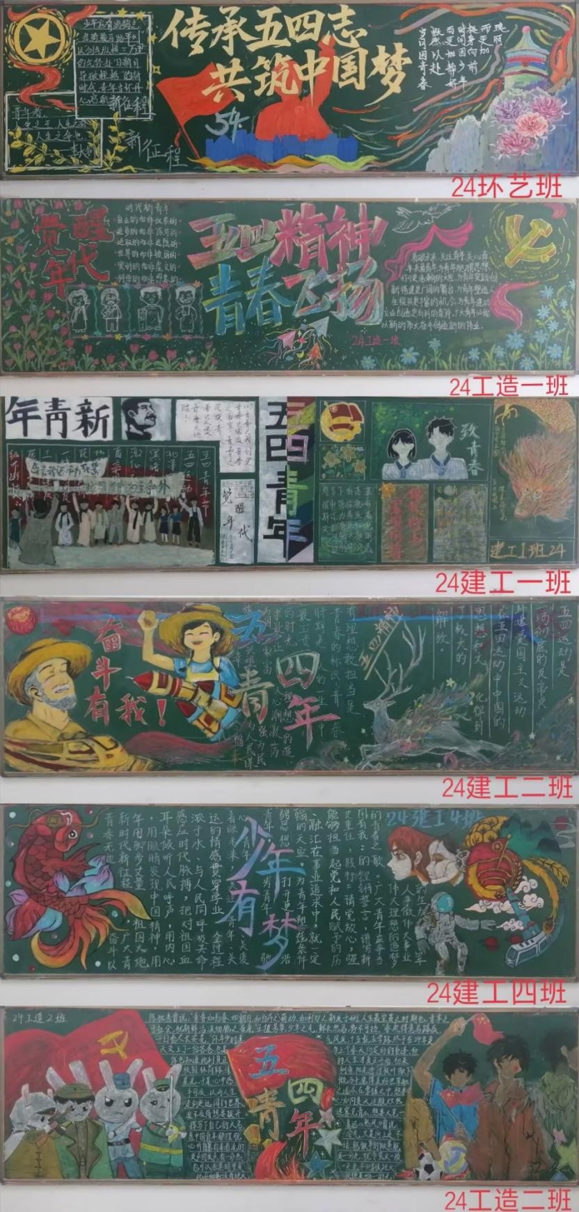 为弘扬五四精神,展现青年学子的艺术风采与创新思维,世界杯体育官方网站开展“五四筑梦行”主题板报绘制评比活动。24级15个班级积极参与,经过激烈角逐,24环艺班等6班级脱颖而出,分别斩获一二三等奖。