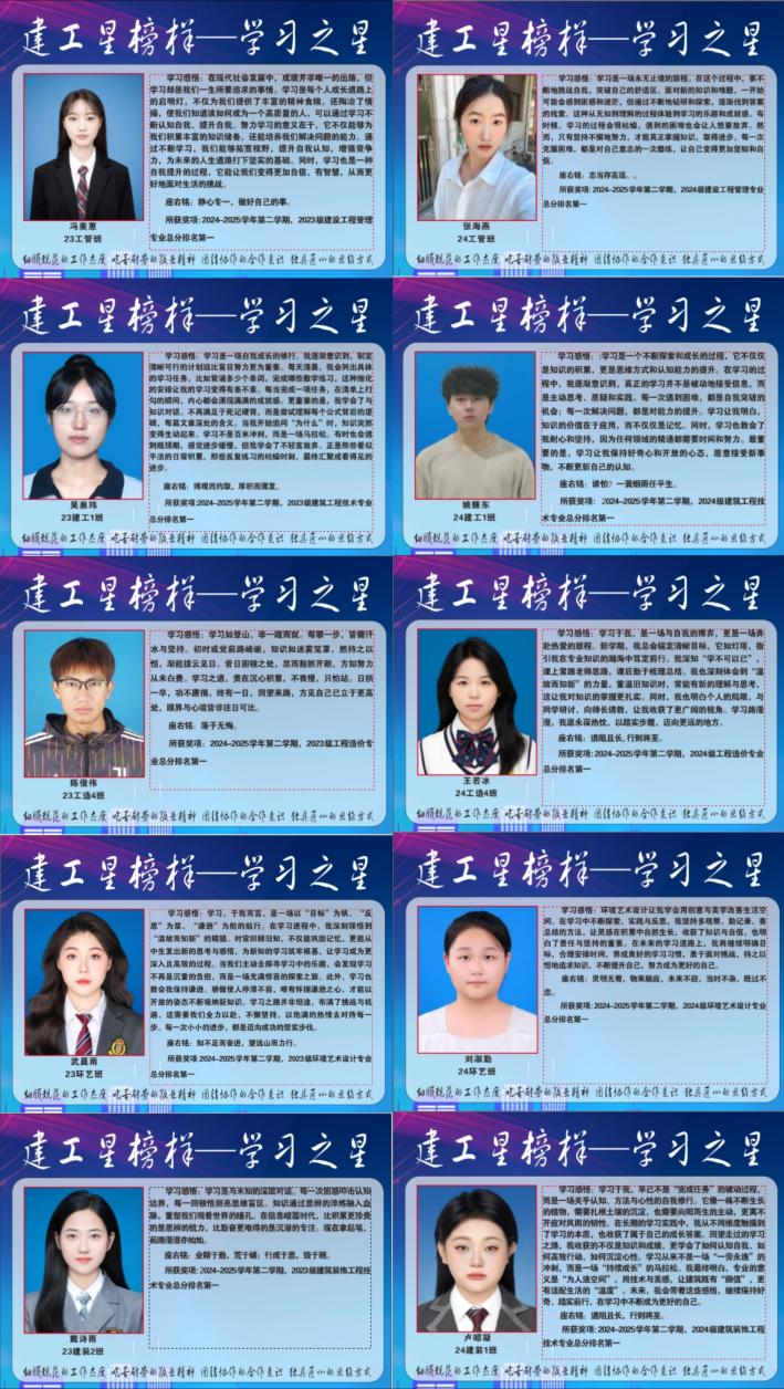 为表彰先进典型,激发学生学习热情,营造“比学赶超”的浓厚氛围,近日,世界杯体育官方网站开展“建工星榜样——学习之星”评选活动,根据2024-2025学年第二学期学业成绩,评选出2023级和2024级各专业总分第一名,共十名优秀学生获得“学习之星”荣誉称号,并于9月8日在教学C楼进行海报展示。