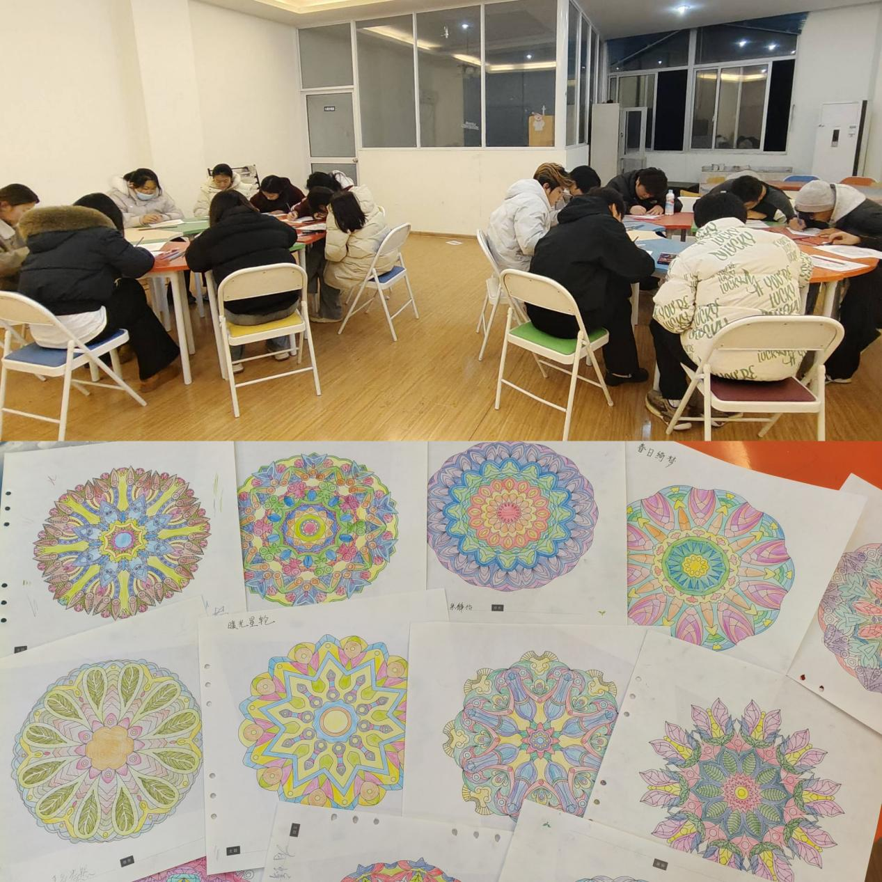 “曼陀罗绘画艺术疗愈活动”于12月16日在大学生活动中心203心理活动室开展。20 余名学生齐聚一堂,在该院心理辅导站负责人李小龙的带领下,通过色彩填充、图案创作释放内心压力。活动现场氛围温馨静谧,学生们手持画笔专注创作,将情绪与思绪融入笔尖,在对称和谐的曼陀罗图案中寻求内心的平静与秩序。“绘画过程中能暂时放下学业压力,这种无声的表达让我感到很放松。” 参与学生分享道。