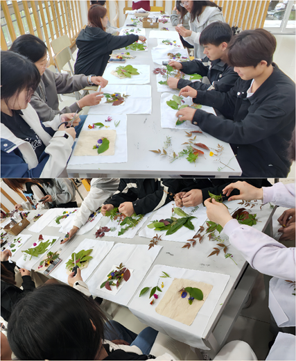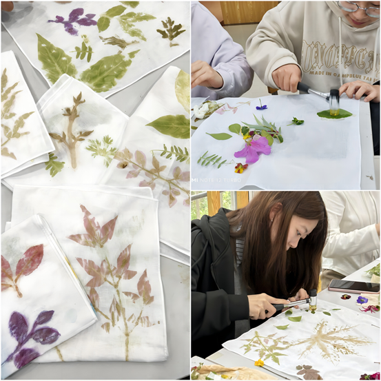 同学们在不破坏环境和植被的前提下捡拾自己感兴趣的树叶或花草,认真学习了植物拓染的技巧和方法,开始动手实践。有的同学小心翼翼地将植物放置在白色画布上,用特制的工具轻轻敲打,使植物的形态和色彩得以完美呈现;有的同学则发挥创意,将多种植物组合在一起,创作出独具特色的艺术作品。
