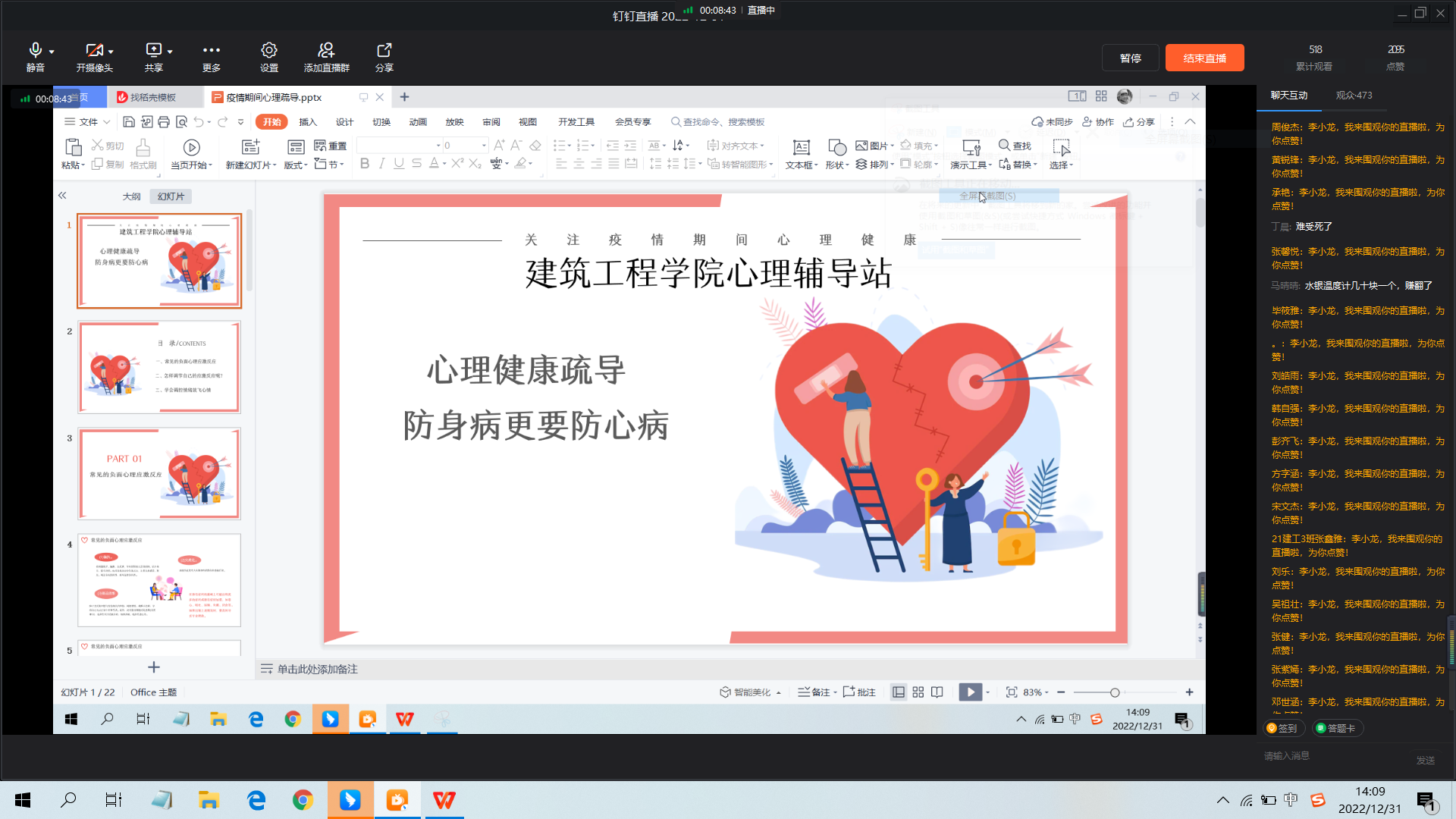 在新冠疫情防控的新形势下,为缓解学生面对奥密克戎来袭的心理压力,调适紧张和焦虑情绪,提高学生对因疫情而出现心理问题的应对技巧,12月31日下午,世界杯体育官方网站组织开展了线上心理疏导讲座,由世界杯体育官方网站心理老师李小龙担任主讲,21级和22级全体学生观看了此次讲座。
